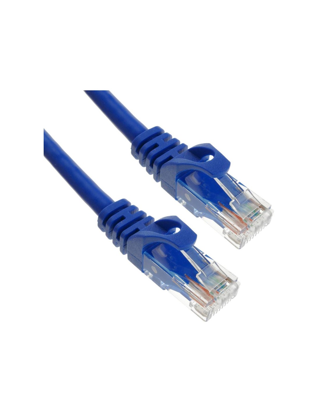 Cables de red azules, de pares trenzados, categoría 6, con conectores RJ45 para la conexión de dispositivos dentro de una red gigabit. Longitud 0.5 cm.