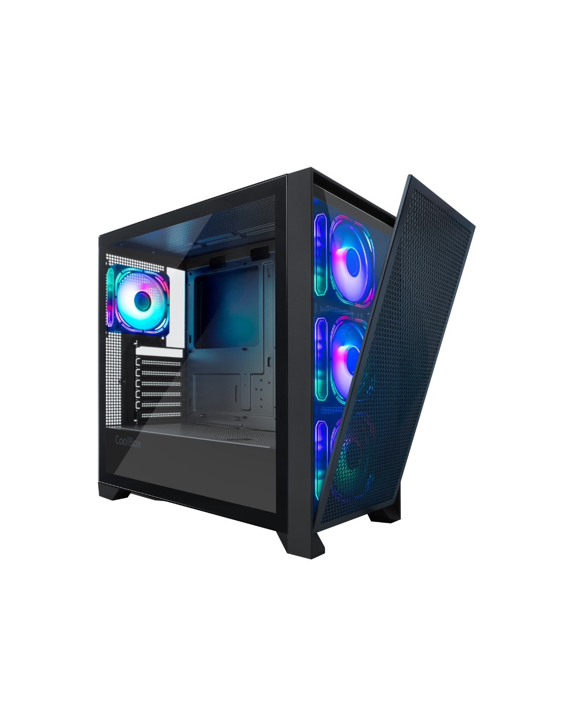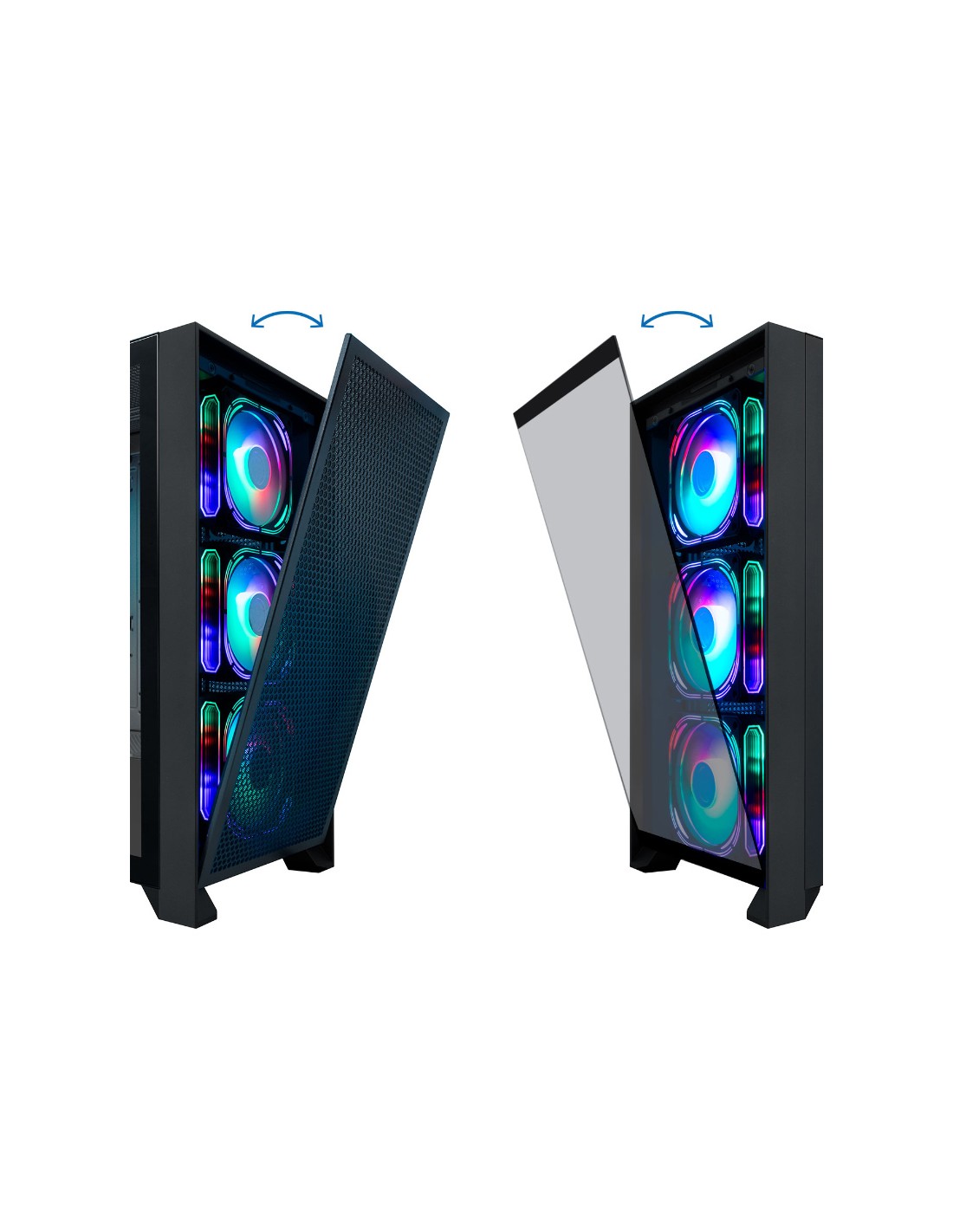 Con frontal doble intercambiable de fijación magnética: cristal templado o metal perforado. Compatible con tarjetas gráficas de hasta 395mm de longitud.